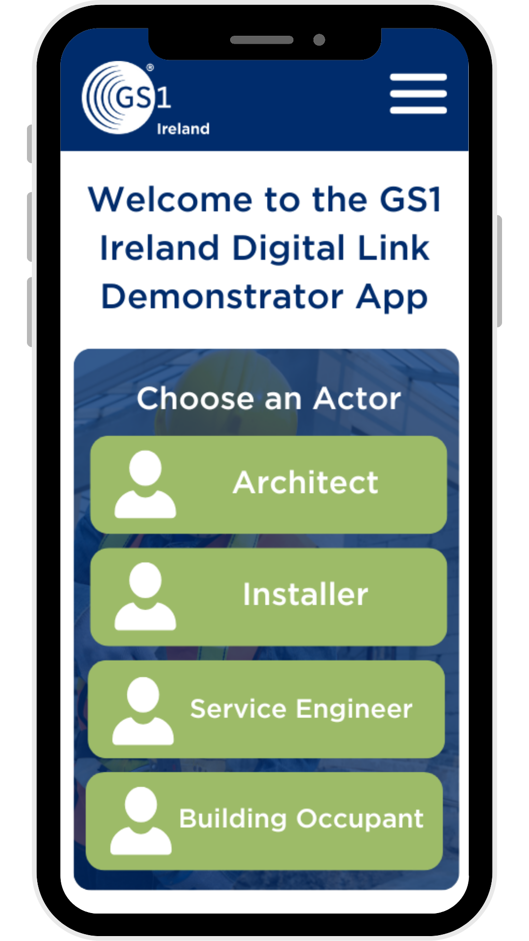 Using a single, real-world product example, a Fire Door Assembly, the app is structured around clearly defined user roles inlcuding an Architect, Building Occupant and Service Engineer. Users select an “actor” and are shown only the information relevant to that role, reflecting how a single Digital Link QR code can deliver different content depending on who scans it and when.